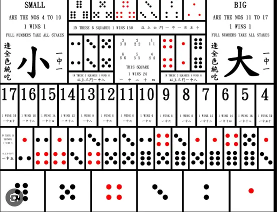 大与小: 最基本的投注类型,玩家可以选择“大小”。若三个骰子的总点数为11至17点,则称为“大”,此时玩家赢得1倍赔付;若总点数为4至10点,则称为“小”,同样为1倍赔付。
